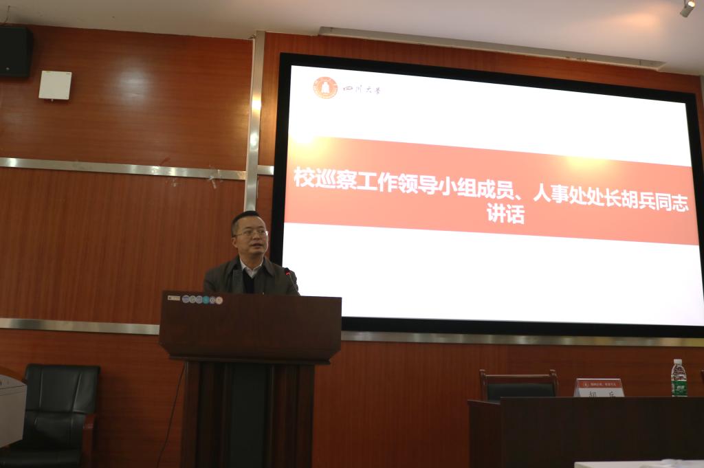 校巡察工作领导小组成员、校人事处处长胡兵同志代表校党委巡察工作领导小组,就党总支支持、配合巡察工作提出五点要求。一是要深刻领会精神,把思想和行动统一到学校决策部署上来。二是要充分给予信任,自觉接受巡察监督。三是要如实反映情况,积极支持巡察组深入了解问题、全面掌握情况。四是要主动配合工作,营造积极参与和主动配合巡察工作的良好氛围。五是要积极进行监督,帮助巡察组严明纪律,强化作风。特别强调要切实落实学校关于疫情防控的决策部署,严格做好疫情防控措施,保证巡察平稳安全推进。