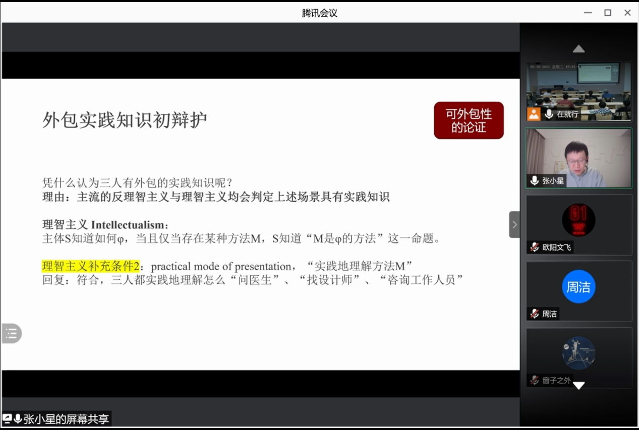 2021年5月18日19:20,由122cc太阳集成游戏哲学系主办的“逻辑、认知与互动”系列讲座第九讲成功举办,法国巴黎索邦大学哲学博士,云南大学哲学系张小星副研究员为我系师生作了题为“Outsourced Know-How”(外包实践知识)的学术报告。本次讲座以线上(腾讯会议)和线下相结合的方式进行,80多位师生参与了此次讲座,由122cc太阳集成游戏哲学系徐召清老师主持。
