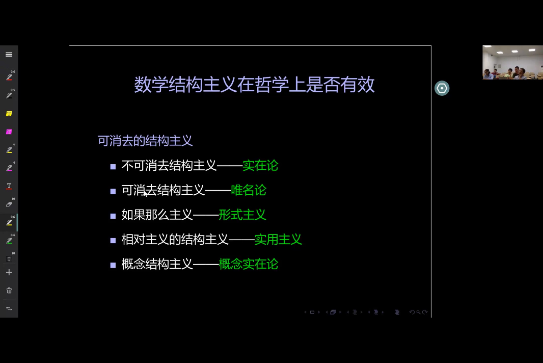 杨睿之老师在本次讲座中,首先介绍了当今数学哲学较为盛行的三大主义:逻辑主义、直觉主义、形式主义。并对结构主义批驳的主要对象集合论基础主义进行了说明:一些数学对象就是特定的集合,数学就是研究集合及其宇宙的。随后通过引入冯·诺依曼和策梅洛对自然数结构的不同定义从而引入对结构主义起源与核心观点的介绍。在此基础上,以结构实在与否作为划分标准,可将结构主义划分为可消去结构主义和不可消去结构主义;以前沿的各种细分结构主义观点为划分,介绍了相对主义的结构主义、概念结构主义、抽象主义的结构主义等。在对结构主义进行了简要介绍后,杨睿之老师首先从哲学的角度试图说明结构主义不是一种有效的数学哲学。主要的观点是因为结构主义本身的建立是批驳集合论基础主义,但集合论基础主义并不真实存在。尤其在现代数学与数学哲学等领域,选取集合论作为数学的基础,往往因为集合论作为一种语言,表达力是足够并且符合直观的,并且研究者往往更加熟悉集合论。