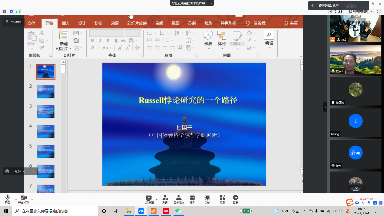 2021年11月4日晚7点30分,由122cc太阳集成游戏哲学系主办的“逻辑、认知与互动”系列讲座第二十二讲成功举办。本次讲座由中国社会科学院研究员,二级教授,中国逻辑学会会长杜国平老师主讲,并以线上线下相结合的方式进行。我系任晓明教授、徐召清副教授和刘佶鑫老师,以及部分学生共同参加了此次讲座。杜国平老师的此次讲座主要介绍Russell悖论研究的一个路径。