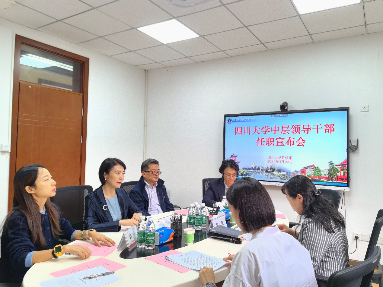 2024年4月23日上午,哲学系干部任职宣布会在望江文科楼205举行,校党委常委、组织部部长黄园同志,组织部张婧同志,哲学系领导班子、科级干部、教研室主任和教师代表等参加会议,会议由史冰川书记主持。
