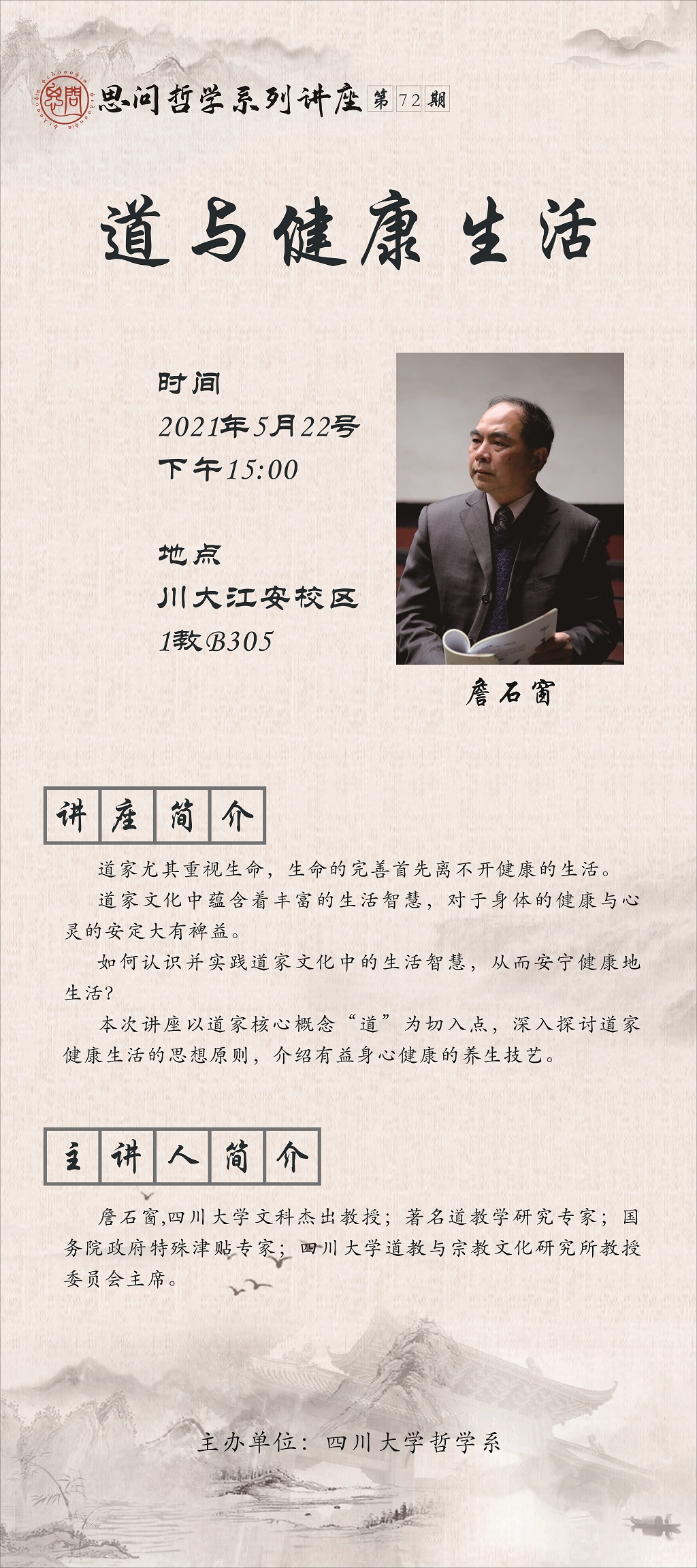 道家尤其重视生命,生命的完善首先离不开健康的生活。道家文化中蕴含着丰富的生活智慧,对于身体的健康与心灵的安定大有裨益。如何认识并实践道家文化中的生活智慧,从而安宁健康地生活?本次讲座以道家核心概念“道”为切入点,深入探讨道家健康生活的思想原则,介绍有益身心健康的养生技艺。