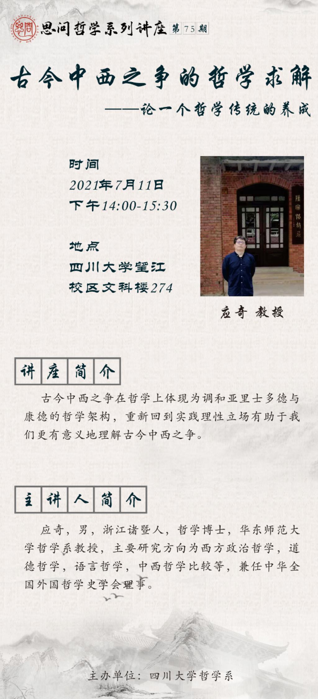主讲人简介:应奇,男,浙江诸暨人,哲学博士,华东师范大学哲学系教授,主要研究方向为西方政治哲学,道德哲学,语言哲学,中西哲学比较等,兼任中华全国外国哲学史学会理事。