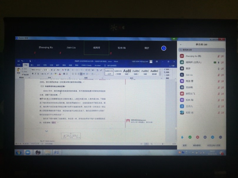 第一期讨论班的主题为“主体的多样性及其互动”。5月21日,借助Zoom会议室这一平台,讨论准时于晚上七点开始。主讲人成凤祥同学以清华大学刘奋荣教授的论文“Diversity of Agents and Their Interaction”为主要材料,对其内容思路做了简要分析。该文章在动态认知逻辑论域下,主要讨论了主体多样性和交互性的问题。