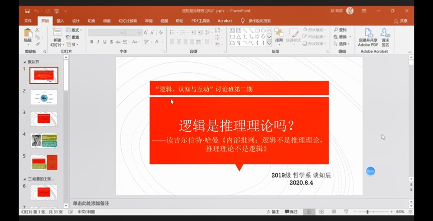 第二期讨论班的主题是“逻辑是推理理论吗?”。6月4日,讨论于晚上七点准时在Zoom会议室线上举行。主讲人谈知辰同学首先概述了报告的内容,紧接着介绍了"逻辑是否是推理理论"问题的哲学史背景,引出了报告的文本——美国哲学家吉尔伯特·哈曼《内部批判:逻辑不是推理理论,推理理论不是逻辑》。