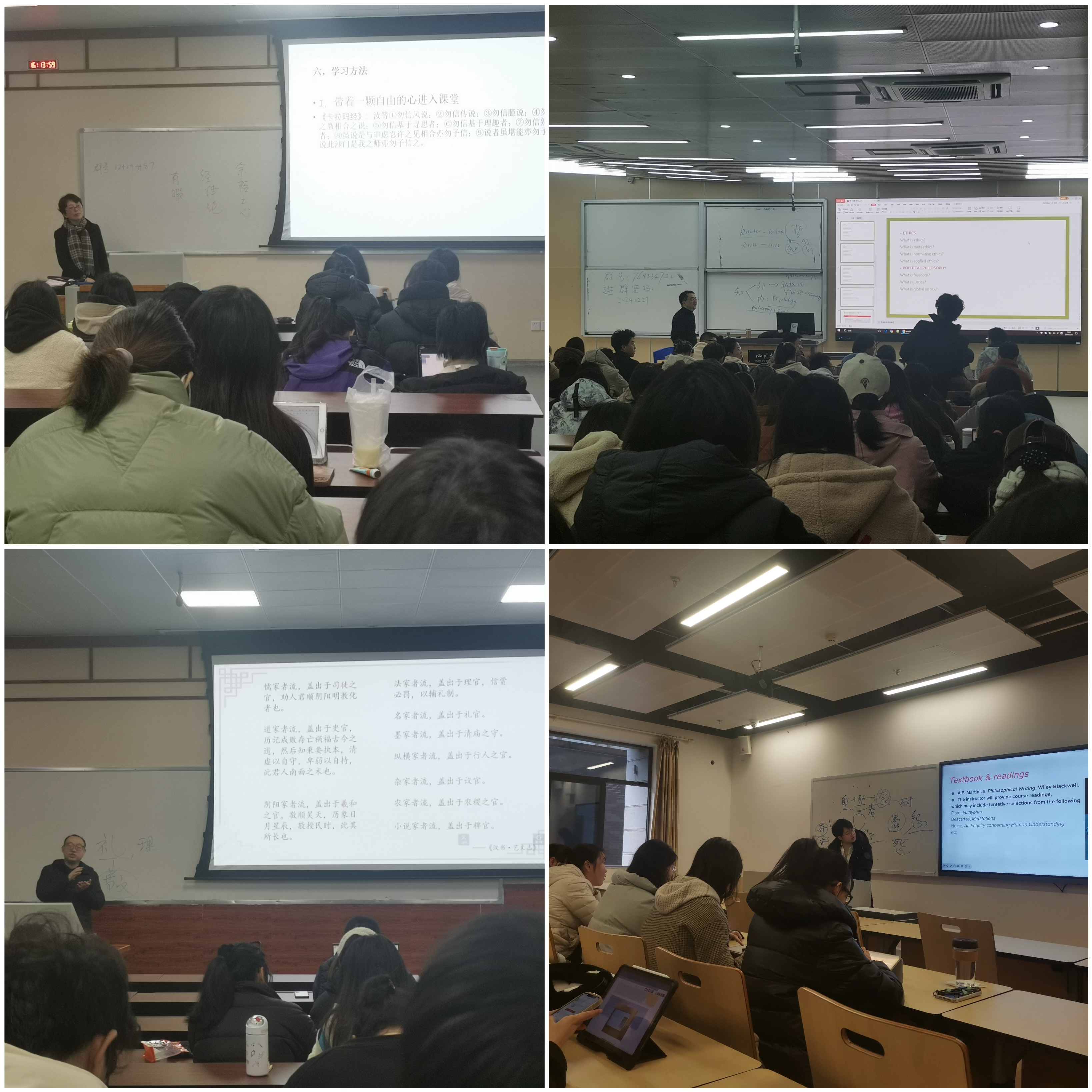 本学期哲学系共承担了38门本科课程的教学任务。通过开学第一周的教学检查,哲学系开学教学状态良好。任课教师均提前到岗,备课充分,授课认真。教师上课均使用多种教学手段,进行多媒体教学,课件要素齐全、字体清晰、内容详实,专业性强,能够在课程内容开始前就本科学期的学期教学计划与课程考核要求进行详细展示与介绍。课堂中呈现出教学内容条理清楚、重点和难点突出、图文并茂,教学活动设计环节齐全,问答、交流充分,教学氛围积极活泼;学生到课率较高,精神状态良好。大多数学生遵纪守时,积极参与课堂互动。哲学系全系师生精神饱满,以崭新的面貌迎接新学期的工作和学习。