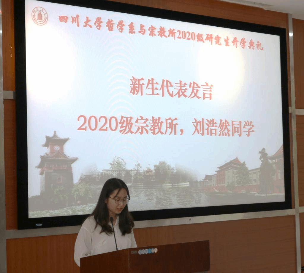 最后,2020级宗教所博士研究生刘浩然同学作为新生代表发言。她结合自己硕士阶段在宗教所的学习和研究经历,分享了自己对学术科研的反思和感悟,强调同学们在研究生阶段不仅要重视理论学习和研究,深耕文本,更要结合田野调查,扎根现实,表达了对于人生新阶段的期待和责任感。
