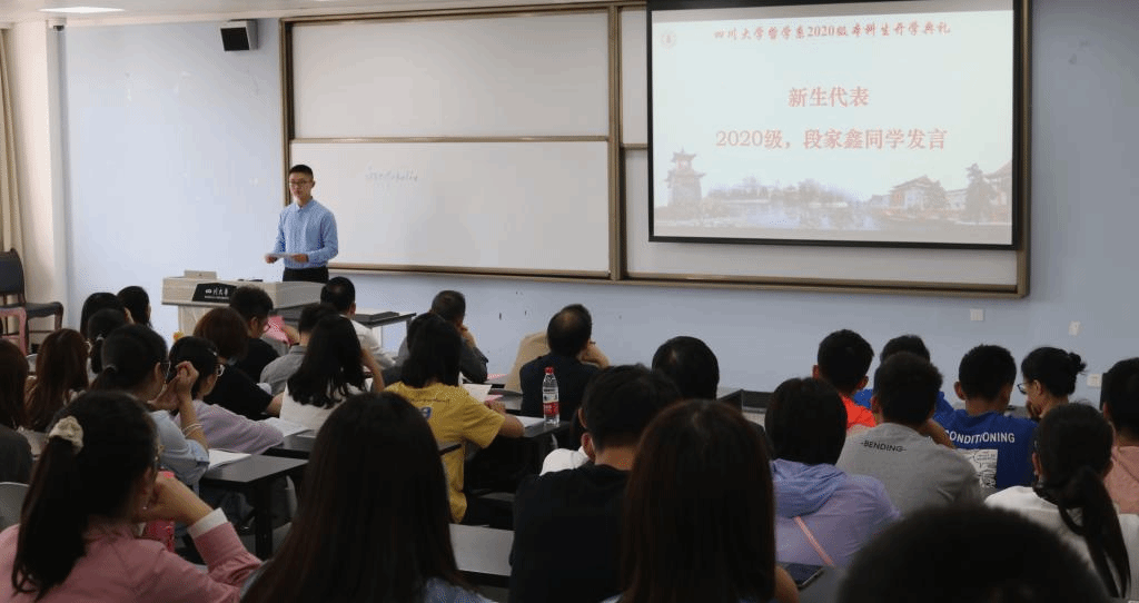 最后,由2020级本科新生段家鑫同学作为新生代表发言。他以高考和入学感言为切入点,从师长和同学关系、大学生活的适应、努力学习和不断提高综合素质等方面表达了对将开启的哲学学习之旅畅想,展现新生积极向上的精神风貌。