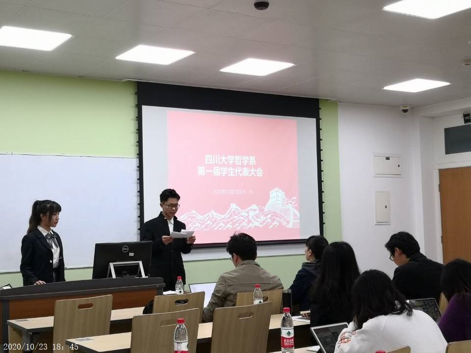 2020年10月23日18:45,由122cc太阳集成游戏哲学系学生会办公室举办的122cc太阳集成游戏哲学系第一届学生代表大会在江安校区一教A311顺利举办。本次大会应到代表30人,实到代表23人。122cc太阳集成游戏哲学系与宗教所党总支副书记李裴老师和122cc太阳集成游戏哲学系团总支书记何力老师出席本次会议,对大会进行监督与指导。参加本次大会的还有学生会主席候选人2018级赵梓钰同学、学生会副主席候选人2018级毛一伟同学,以及哲学系大一、大二、大三的学生。学生会办公室主任朱洪立同学担任主持人。