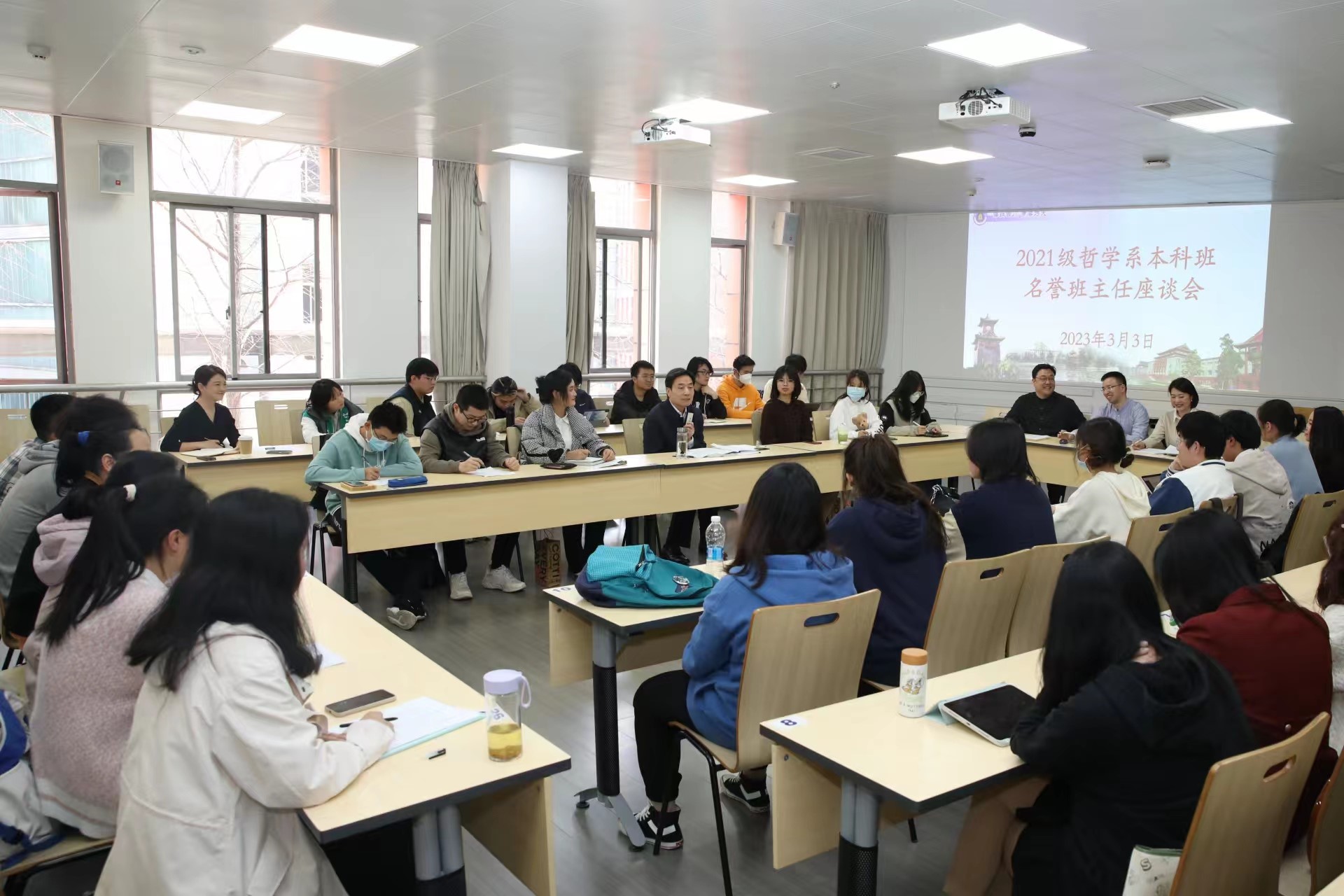3月3日,校党委书记甘霖来到2021级哲学系本科班开展名誉班主任活动,关心了解同学们的学习生活情况。
