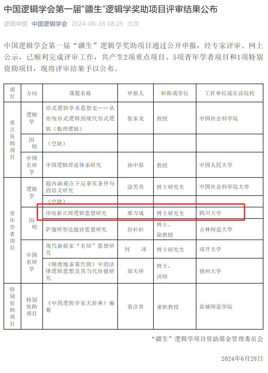 6月28日,中国逻辑学会发布第一届“疆生”逻辑学奖助项目评审结果,我系2021级逻辑学方向博士研究生邢万成同学获奖。此项目为鼓励世界三大逻辑体系在中国的研究与进步,经中国逻辑学会常务理事会研究决定,决定发布中国逻辑学会第一届“疆生”逻辑学奖助项目,旨在推动当代逻辑学在中国的进一步发展。