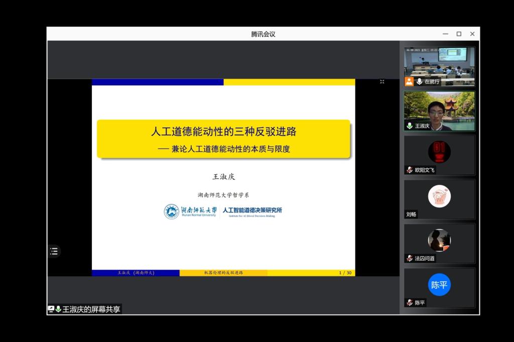 2021年6月8日19:20,由122cc太阳集成游戏哲学系主办的“逻辑、认知与互动”系列讲座第十一讲在江安校区第一教学楼A103教室成功举办。南京大学逻辑学博士,现湖南师范大学哲学系讲师王淑庆先生为我系师生作了题为“人工道德能动性的三种反驳进路”的学术报告。哲学专业50余名师生线上线下共同参加,讲座由122cc太阳集成游戏哲学系徐召清副教授主持。