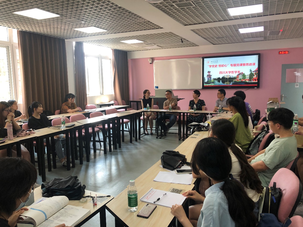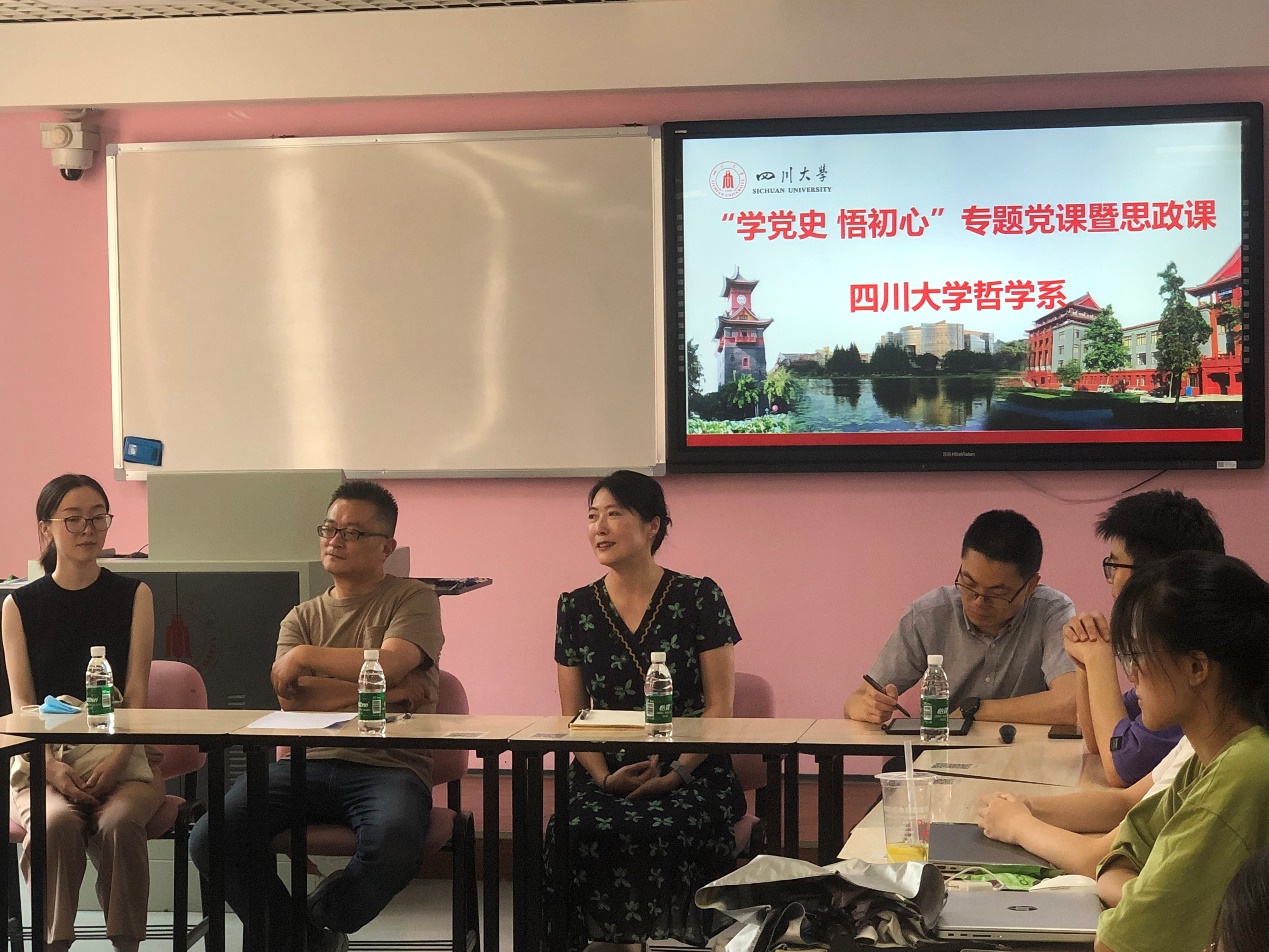 2021年6月22日14:00,哲学系2018级本科生专题党课暨思政课在望江校区基础教学楼A座310室顺利开展。2018级全体本科生参加,哲学系与宗教所史冰川书记、哲学系系主任熊林教授,综合导师吴瑶和党政办胡康林老师参加和出席。