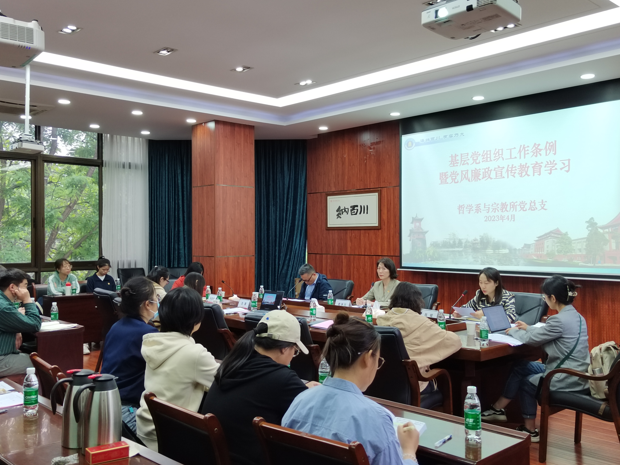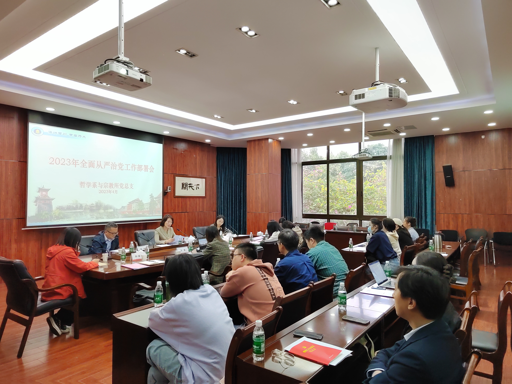 2023年4月28日下午,哲学系与宗教所党总支全面从严治党工作部署会暨党风廉政宣传教育活动在望江文科楼200号会议室举行,党总支领导班子、党总支委员、组织员、科级干部、党支部书记、党支部委员及师生代表参加会议。会议由史冰川书记主持。