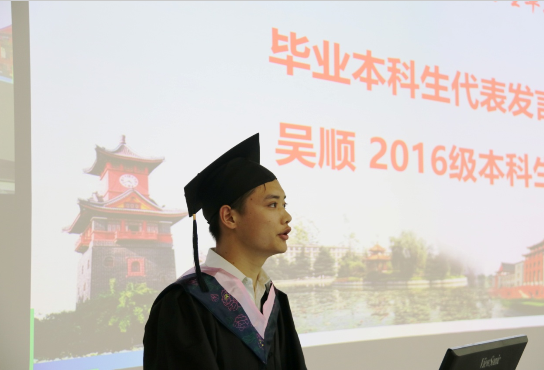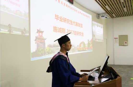很荣幸·作为·哲学系·2020届的毕业生·代表在此发言。岁月无痕,韶光易逝,入学时一起聆听老师对新生致辞的场景仍历历在目,转眼间我们已穿上学士服徜徉在川大的每一个角落。今天我们就要毕业了,在此我代表哲学系的同学向哲学系的老师们表示最衷心的感谢,感谢您们4年的谆谆教诲,感谢您们4年来带领我们进入哲学殿堂的每一份努力。谢谢!(发言人鞠躬)