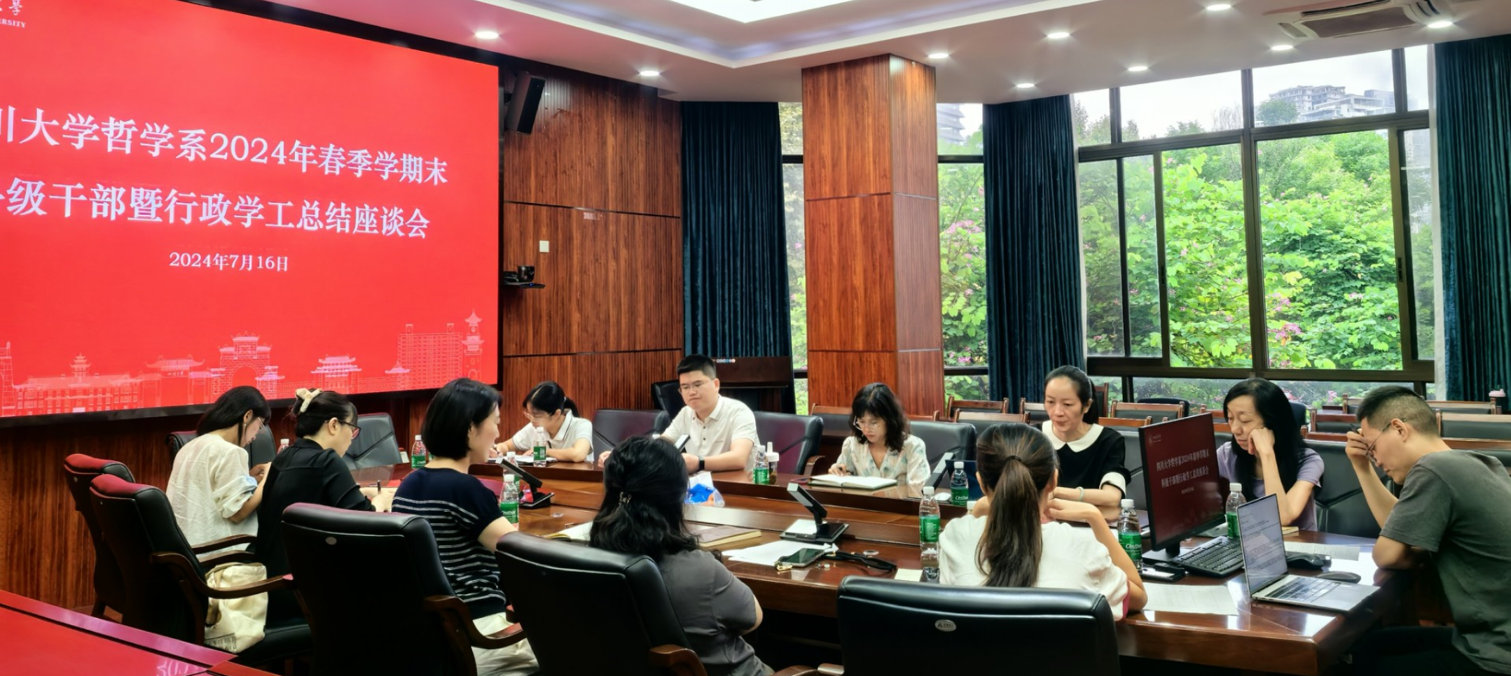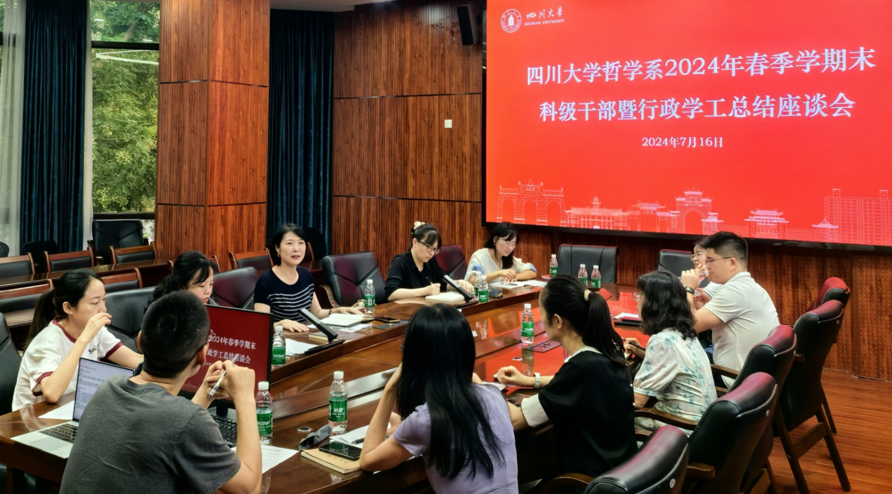 2024年7月16日上午,哲学系2024年春季学期末科级干部暨行政学工座谈交流会在文科楼200号举行,哲学系领导班子、系主任助理、科级干部、辅导员等参加会议,会议由史冰川书记主持。