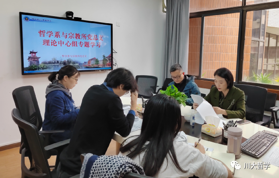 2022年10月19日下午,哲学系与宗教所党总支理论学习中心组在文科楼205开展党的二十大精神专题学习会议,全体党政班子参加,学习会议由党总支史冰川书记主持。