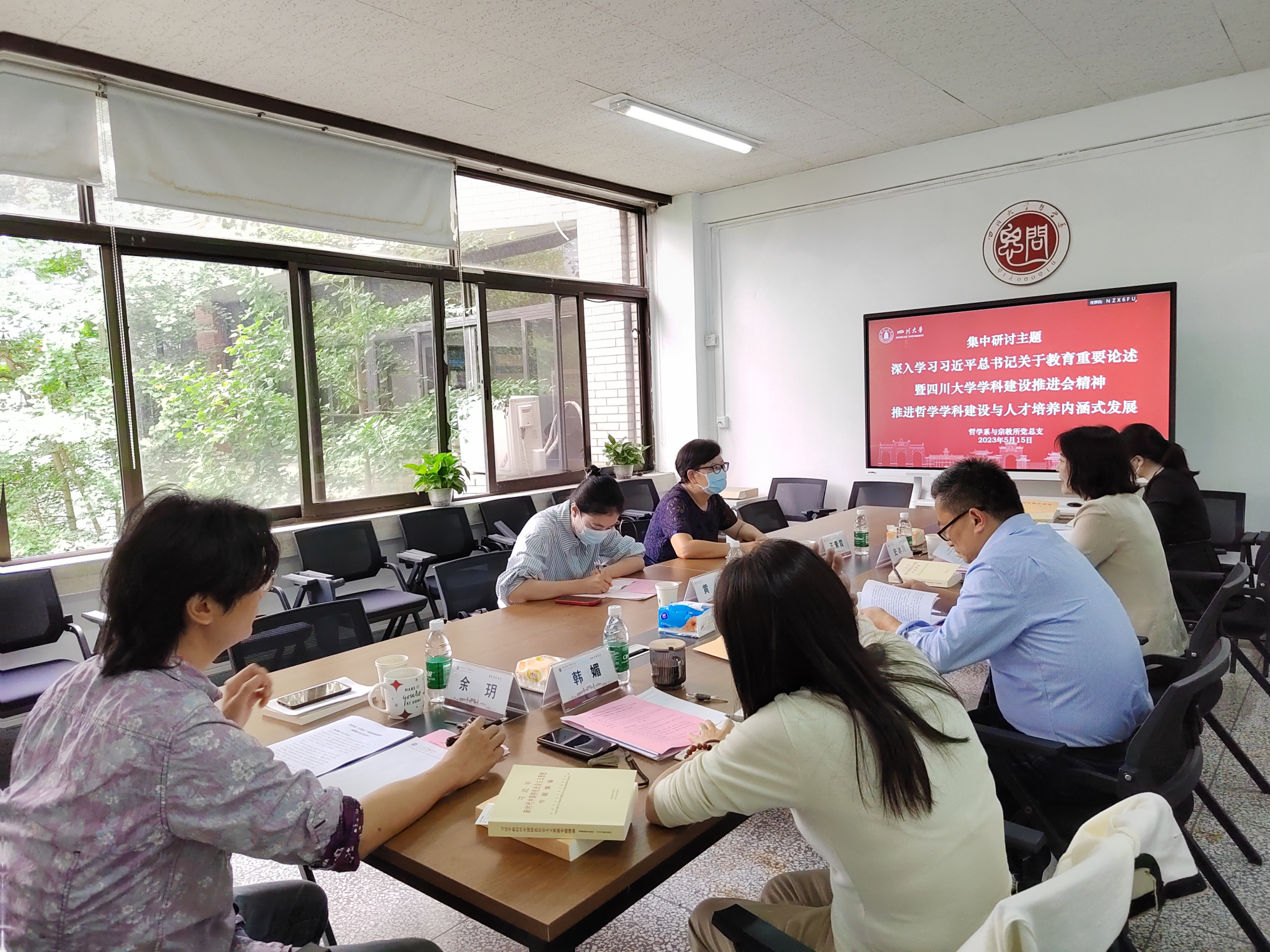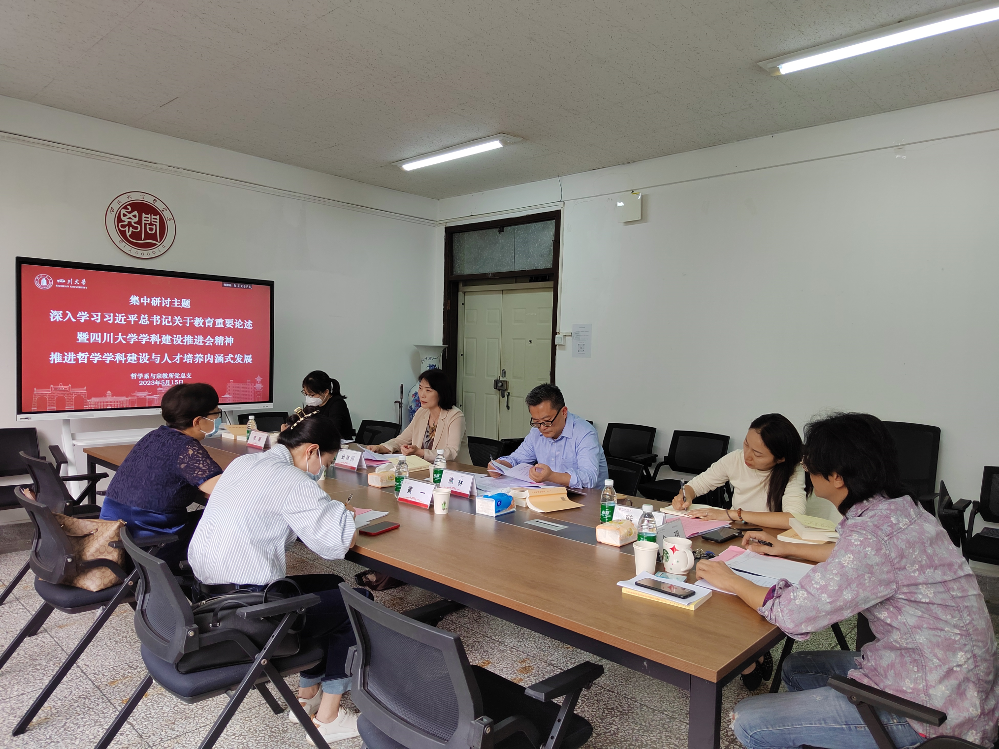 5月15日下午,哲学系与宗教所党总支领导班子学习贯彻习近平新时代中国特色社会主义思想主题教育读书班第一次集中研讨会在望江校区文科楼423举行。校主题教育第四指导组组长王素霞、成员黄一到会指导,党总支全体领导班子成员参加研讨,会议由党总支书记史冰川主持。