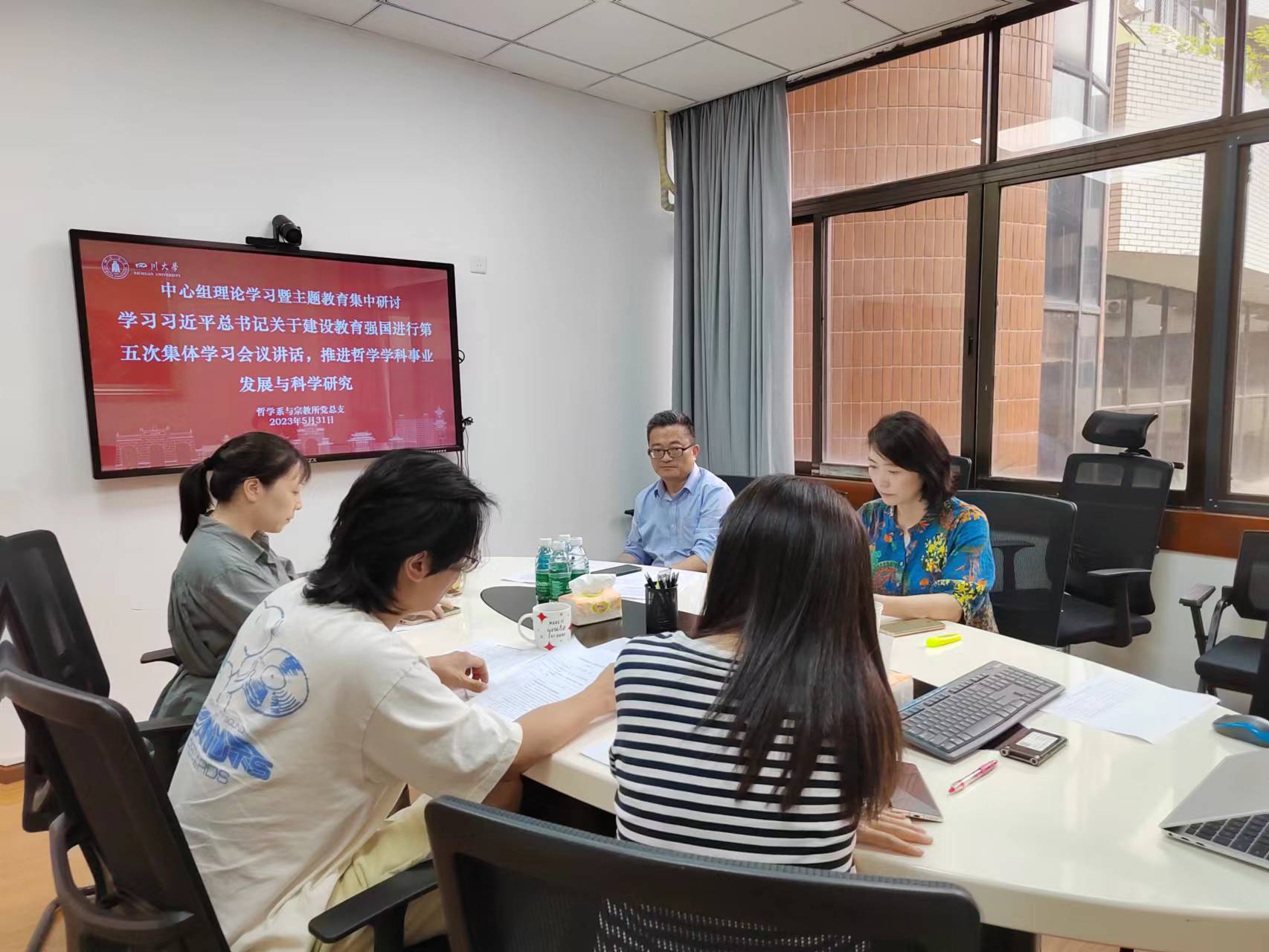 2023年5月31日下午,哲学系与宗教所党总支领导班子学习贯彻习近平新时代中国特色社会主义思想主题教育读书班第三次集中研讨会暨中心组理论学习会,在望江校区文科楼205举行。本次研讨会主题为“学习习近平总书记关于建设教育强国进行第五次集体学习会议讲话,推进哲学学科事业发展与科学研究”。党总支领导班子成员参加研讨,会议由党总支书记史冰川主持。