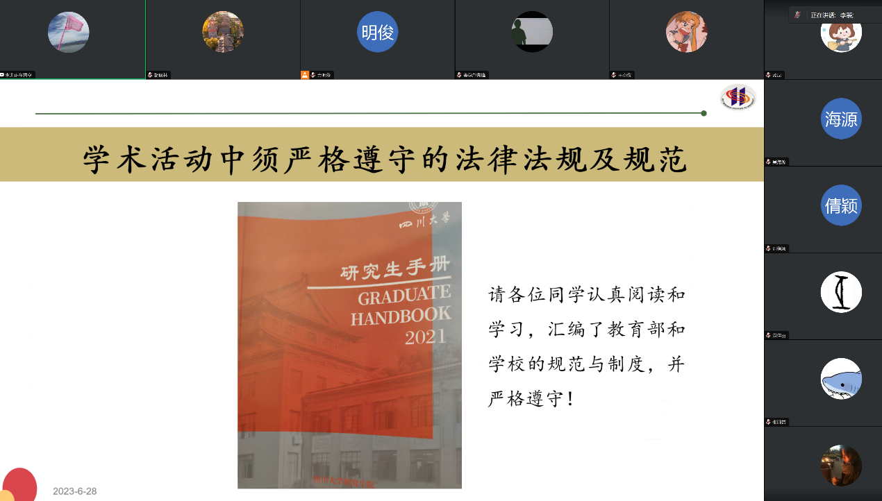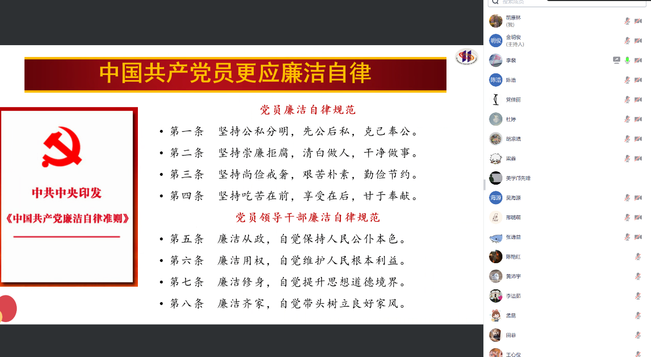 李裴老师以《坚守学术道德与学术诚信,争做廉洁优秀研究生党员》为题,从《大学》的正心诚意和《中国共产党廉洁自律准则》等引入微党课主题。她结合自身教学科研和工作经历,以及精彩历史典故、学术研究案例,为支部党员同学重点讲述了学术道德、学术规范和学术不端的内涵概念、表现形式以及影响等,并结合122cc太阳集成游戏研究生学术规范和要求作了强调,希望全体研究生党员同学带头遵守学术道德与学术规范,做真人和做真学问。