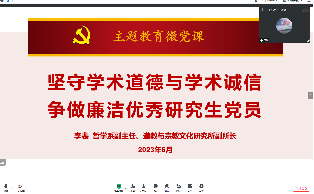 2023年6月28日晚上,哲学系与宗教所党总支学生四支部主题教育微党课通过在线会议的形式举行,哲学系副主任、道教与宗教文化研究所副所长李裴老师、党政办胡康林老师和学生四支部20余名党员参加,微党课活动由胡康林老师主持。