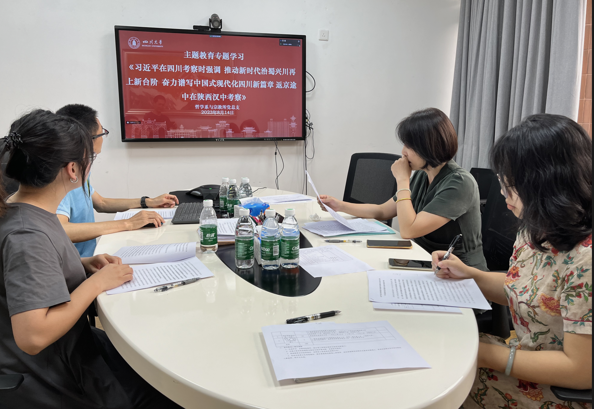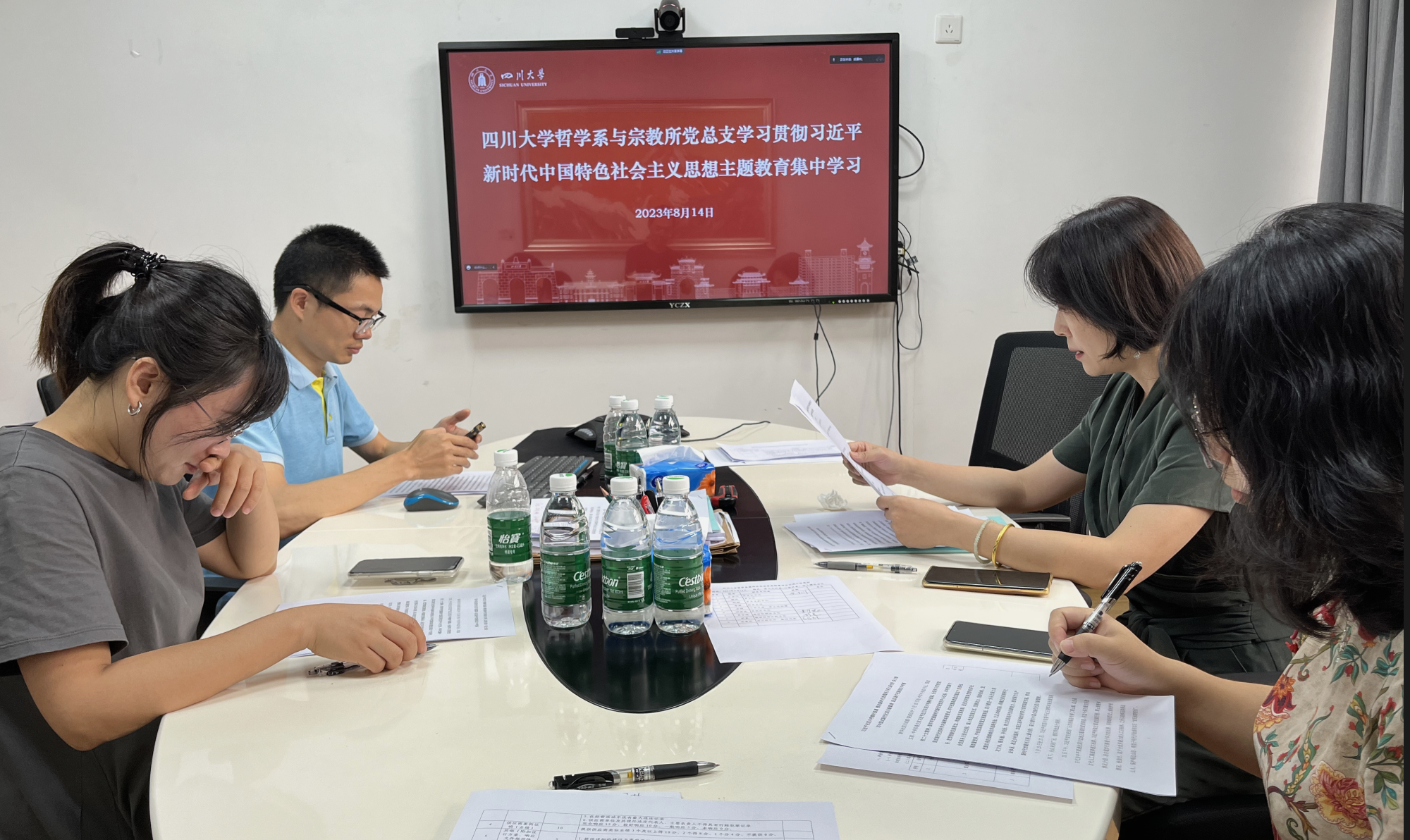 2023年8月14日下午,哲学系与宗教所党总支领导班子学习贯彻习近平新时代中国特色社会主义思想主题教育读书班第五次集中研讨会暨理论学习中心组(扩大)学习会议,在望江校区文科楼205举行。本次研讨会主题为“习近平新时代中国特色社会主义思想学习,打牢主题教育专题民主生活会思想基础”。党总支领导班子成员、科级干部和教师代表,通过线上线下结合的方式参加,会议由党总支书记史冰川主持。